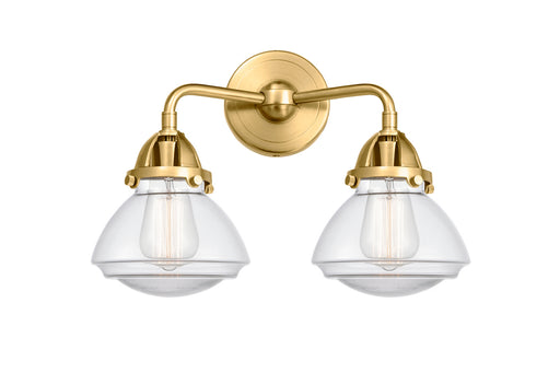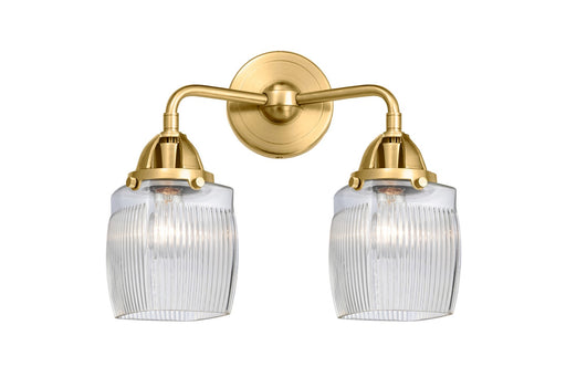 Colton - 2 Light - 14 inch - Satin Gold - Clear Halophane Shade - Bath Vanity LightDetails:Product Type: Two LightsFinish: Satin GoldShade: Thick C...