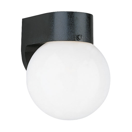 A black polycarbonate wall bracket featuring a white 6 inch acrylic globe. Adds modern flair to an outdoor space.Details:Product Type: OutdoorFinis...