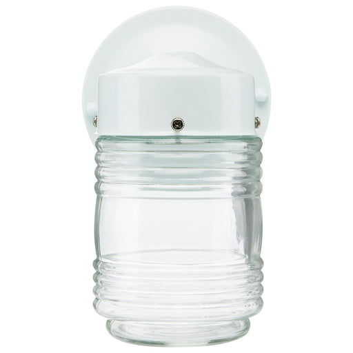 An outdoor "jelly jar" utility wall lantern featuring a white powder-coated finish and clear marine glass. The fixture is wet location listed and i...