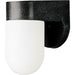 A black polycarbonate wall lantern featuring a white acrylic cylindrical diffuser. Adds modern flair to an outdoor space.