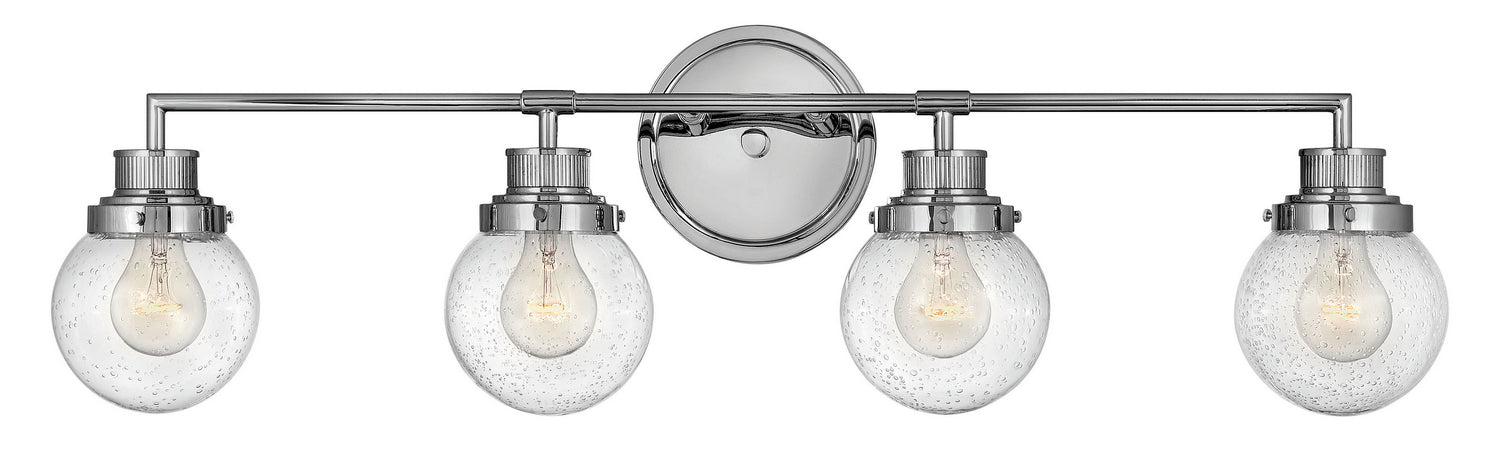 Poppy features clear seedy glass spheres that bubble out of refined, ribbed fitters to create a simple, yet sophisticated silhouette. The dual-finish combinations, Black with Brushed Nickel and Black with Heritage Brass, pair perfectly with a clean backplate or canopy and crisp crossbars to anchor this airy design. Poppy showcases mid-century style with a spectacular spin.