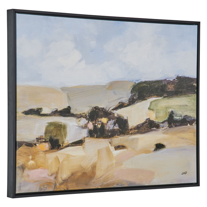 The Desert Moment Framed Canvas Displays An Abstract Desertscape In Cool Powder Blue, Sand, And Sage Green Tones. A Solid Wood Gallery Frame With Black Finish Completes The Artwork. Each Canvas Is Proudly Handcrafted And Printed In The USA. Artwork By Julia Purinton.