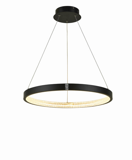 Emeri collection in Black illuminates from the top and bottom of the metal ring. 60W integrated LED, 3000K 80+ CRI, 5400 Lumens. Adjustable heights...