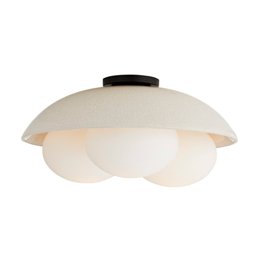 The Glaze large flushmount light fixture features a trio of frosted opal glass globes cocooned within a large ivory stained crackle ceramic bowl. T...