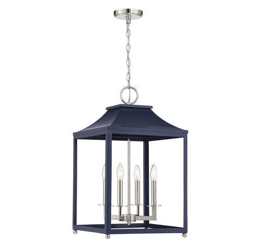 Crisp and traditional lantern style lighting is given an update in this Meridian 4-light pendant, which features a navy blue finish accentuated by ...