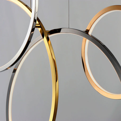 Circular bands, like ornaments, descend from thin low voltage cables in a variety of configurations. An evenly diffused LED tube spans the distance...