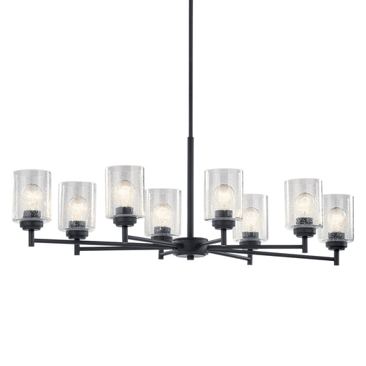 The modern Winslow 8 light chandelier in a Black finish with Clear Seeded glass shade pair beautifully with the linear arms, bringing light and dim...