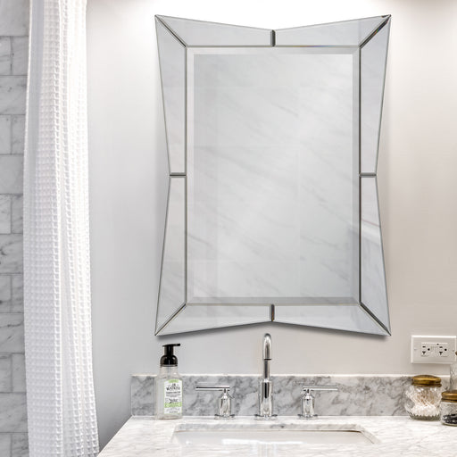 This piece features an all-glass mirror design in a unique shape with beveled mirrors.Details:Product Type: Mirrors-Rect./Sq.Finish: All GlassMeasu...