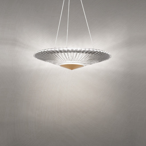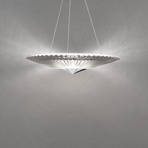 Calming and prescient, the Origami Collection proffers a simple elegance. Folds in the patterned hand-cut crystal glass shade act as prisms, bendin...