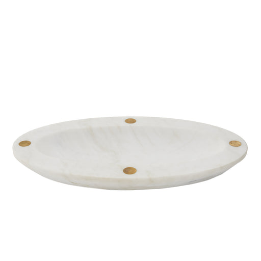 This heavyweight beauty is carved from solid white marble and dotted with antique brass inlays. Filled with objects or as a stand-alone centerpiece...