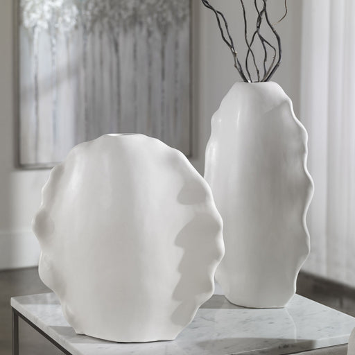 Set Of Two Ceramic Vases Model Organic Curved Edges That Create An Artistic Look And Are Finished In A Modern Matte White Glaze. May Be Used Outdoo...