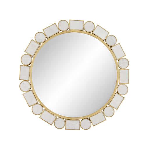 Individual white marble stones in geometric form embellish a gold leaf iron frame that surrounds a beveled glass mirror recalling decorative antiqu...