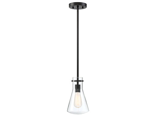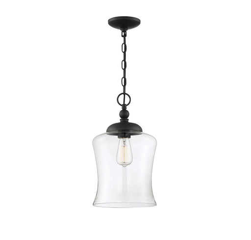 Use this 1-light pendant to change up your lighting style! Features a curving shade of clear glass and a matte black finish. 10.5" in height and 6....