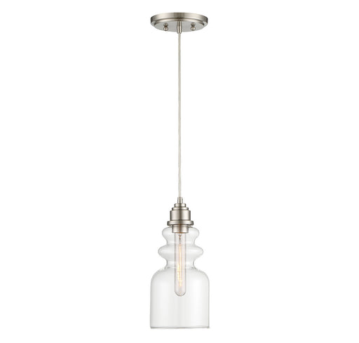 The curving of the clear glass shade on this 1-light pendant is inspired by the look of glass telephone line insulators. Finished in Brushed Nickel...