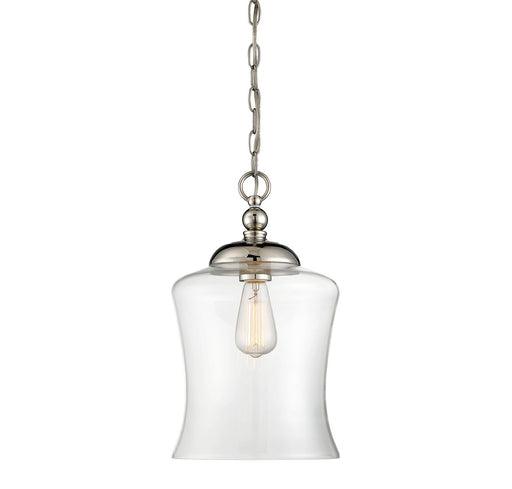 This 1-light pendant showcases a curving shade of clear glass and is finished in Polished Nickel. 16.5" in height and 9.75" in width.Details:Produc...