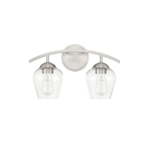 Shape up your bath lighting style with this 2-light bathroom vanity light! Between the curving arm, the wineglass-style clear glass shades and the ...