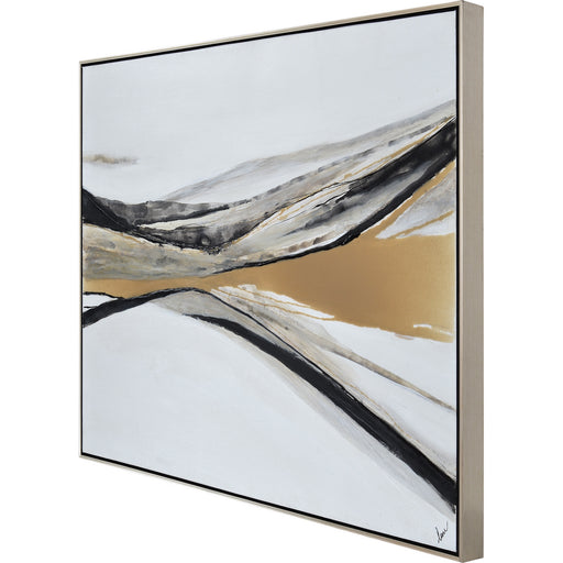 Gold leaf accents create compelling textures in this abstract painting on canvas. Cascading shades of white, black and smoky gray form an enchantin...