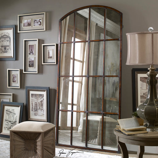 This Oversized Arch Features A Forged Iron Frame In A Hand Applied Warm Bronze Finish With Burnished Distressing Encasing An Antique Style Mirror.D...