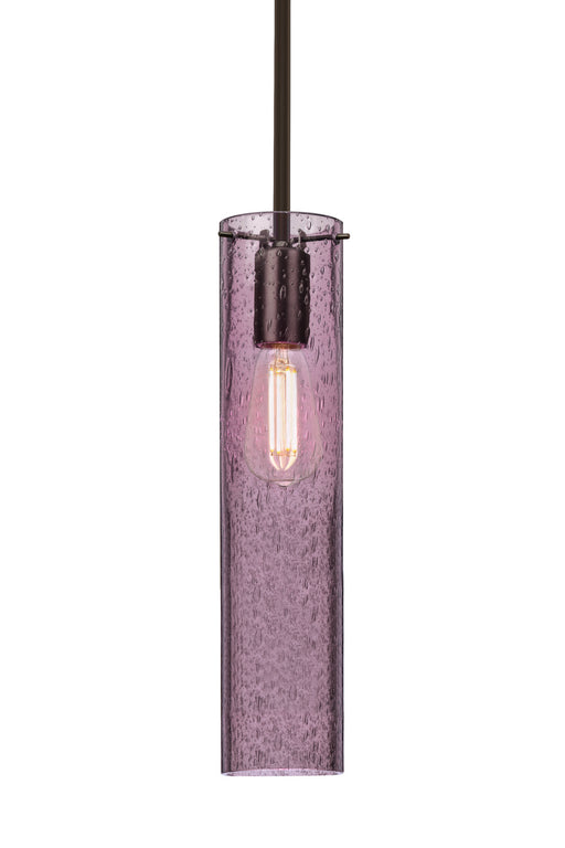 The Juni 16 Pendant is composed of a narrow transparent Plum glass cylinder, with an interesting bubble pattern blown randomly throughout the glass...