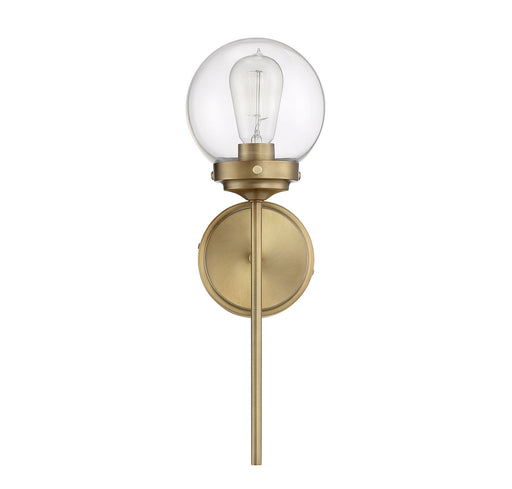 Get industrial with this bold 1-light sconce, offering a long arm, an orb-shaped shade of clear glass and a Natural Brass finish. 18" in height and...