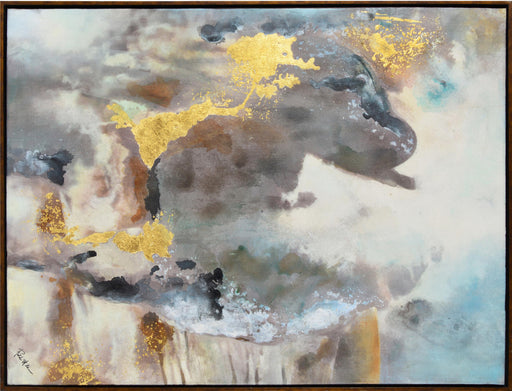 Gold leaf accents create compelling textures in this abstract painting on canvas. Cascading shades of white, black and smoky gray form an enchantin...