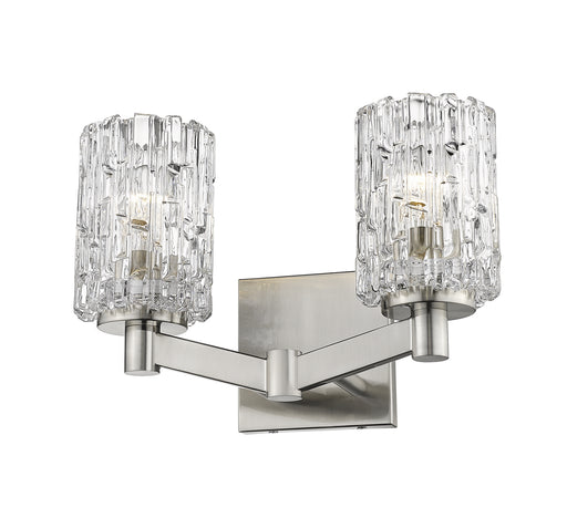 Modern design creates a silhouette worth showcasing in a contemporary bath space. This brushed nickel steel and crystal cut clear glass two-light v...