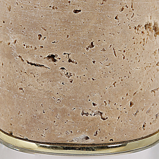 Crafted With Precision, These Sculptural Forms Feature Beige Unfilled Travertine Elevated By Thick Clear Crystal Bases. Bisected By A Steel Disc Fi...