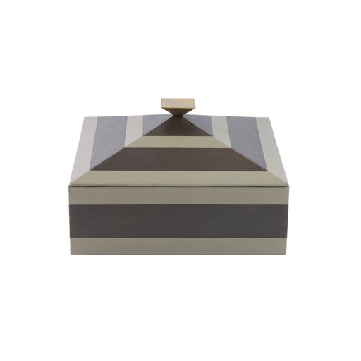 Tonal stripes add a tailored finish to a two-toned dove and graphite leather box. This pyramid-inspired accessory is topped with a bronze-plated ha...