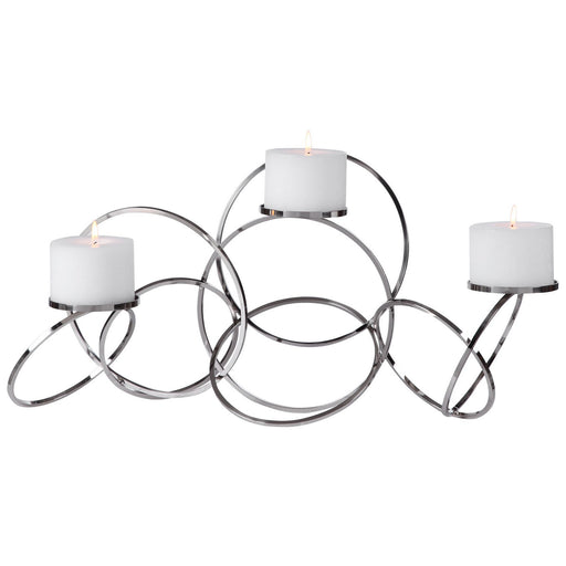 Modern Candleholder Features An Intertwined Ring Design And Is Finished In Polished Nickel. Three 4"x 3" White Candles Are Included.Details:Product...