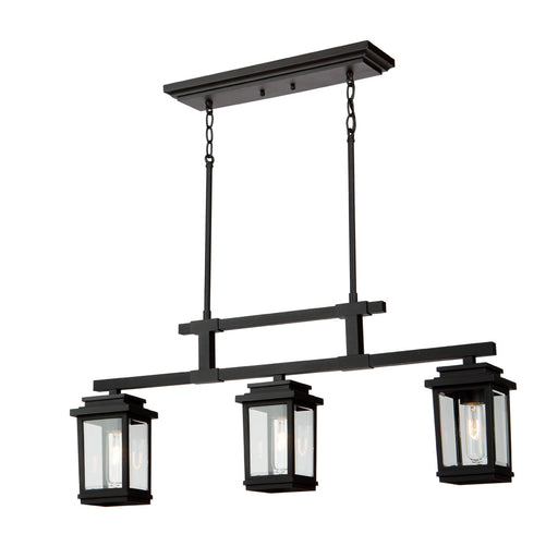 The "Freemont" collection of exterior chandeliers is clean and precise. This 3 light linear chandelier features clear glassware. This "Freemont" co...