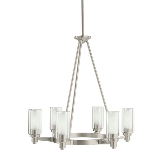 The Circolo 26.5" 6 light round chandelier features a Brushed Nickel finish and clear outer and satin etched inner glass cylinders for a classic lo...