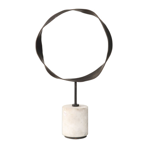 Cast Metal Ring Sculpture With An Antique Bronze Finish And Gold Highlights, Set On A White Marble Cylinder Base.Details:Product Type: Statues/Scul...