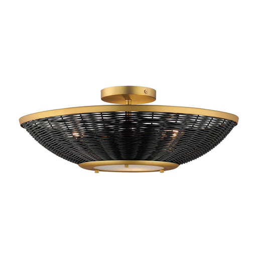 Hand-woven rattan is blackened and configured into a series of pendants and a dual-purpose wall sconce and flush mount. The blackened rattan is con...