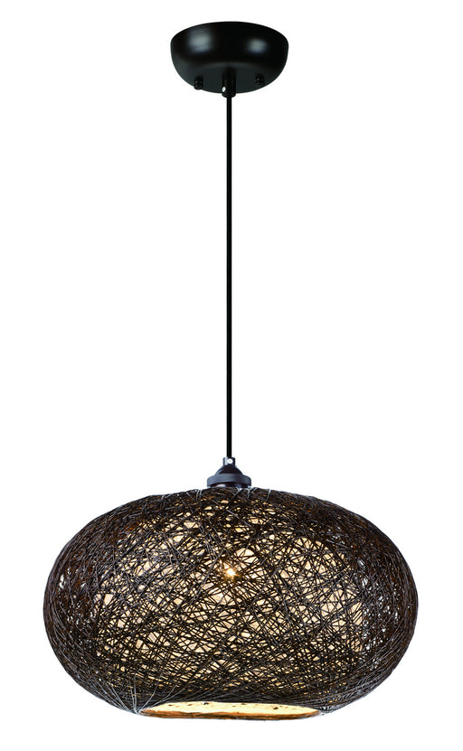 Woven bamboo strips are used to make a layered coastal pendant. Light escapes between the gaps in the material that is woven by hand that has a hom...