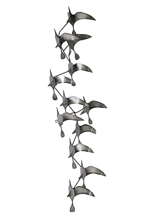 The metallic silhouette of this traditional wall decoration features a flock of birds flying in formation against an invisible wind current. Each g...