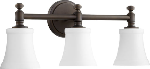 View full detailsQuorum 5122-3-186 Three Light Vanity, Oiled Bronze w/ Satin Opal