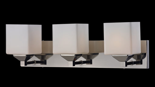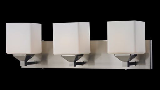 Rectangular shaped hardware and complimenting cube shades create a straight contemporary look. This three light vanity is finished in brushed nicke...