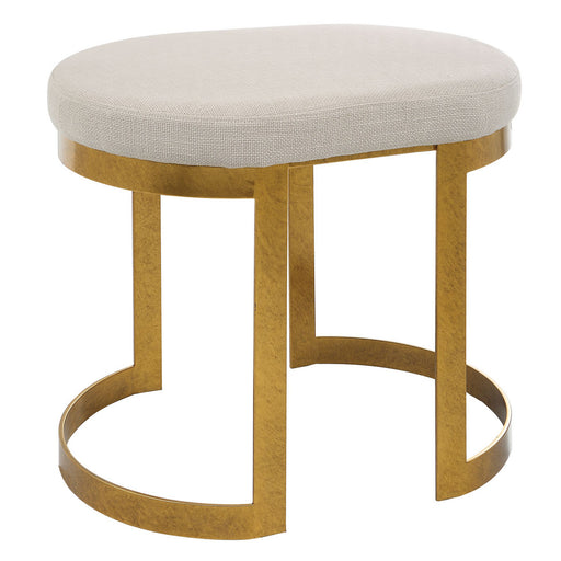 Classic Yet Stylish, This Small Bench Features A Curved Iron Frame Finished In An Elegant Gold Leaf. The Cushioned Top Is Upholstered In A Crisp Wh...