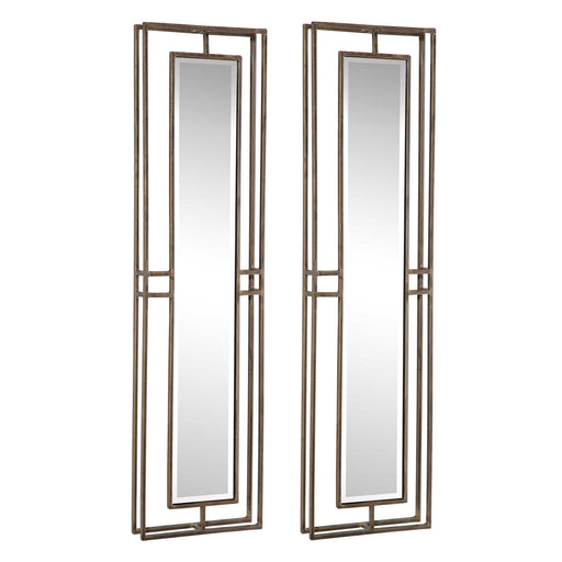 Clean And Contemporary, Each Mirror Exhibit Linear Metal Frames With A Nearly Two Inch Open Depth. Each Frame Is Finished In A Heavily Antiqued Gol...