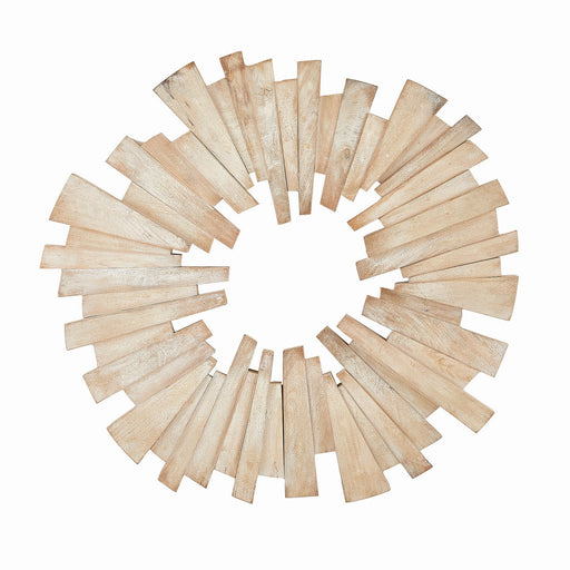 A sandblasted round of lime-washed mango wood adds an explosive impact to any wall. Crafted with a stacked sunburst shape to add dimension and lami...