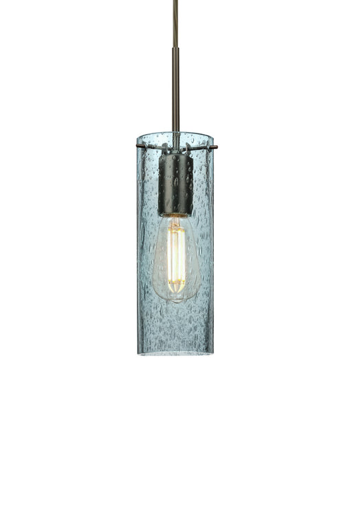 The Juni 10 Pendant is composed of a transparent Blue glass cylinder, with an interesting bubble pattern blown randomly throughout the glass. The p...