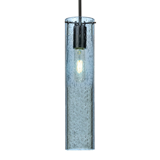 The Juni 16 Pendant is composed of a narrow transparent Blue glass cylinder, with an interesting bubble pattern blown randomly throughout the glass...