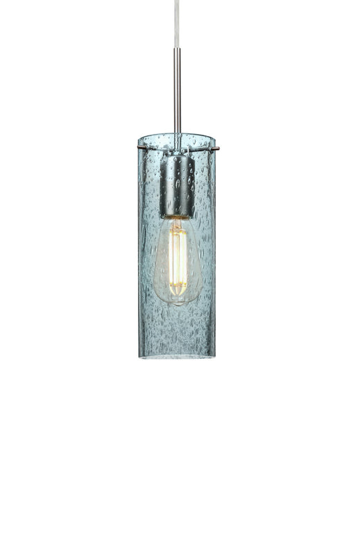 The Juni 10 Pendant is composed of a transparent Blue glass cylinder, with an interesting bubble pattern blown randomly throughout the glass. The p...