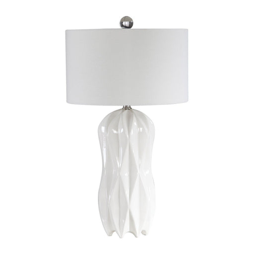 Modern Style Emanates From This Table Lamp With An Embossed Geometric Pattern Finished In A Glossy White Glaze Accented With Polished Nickel Detail...