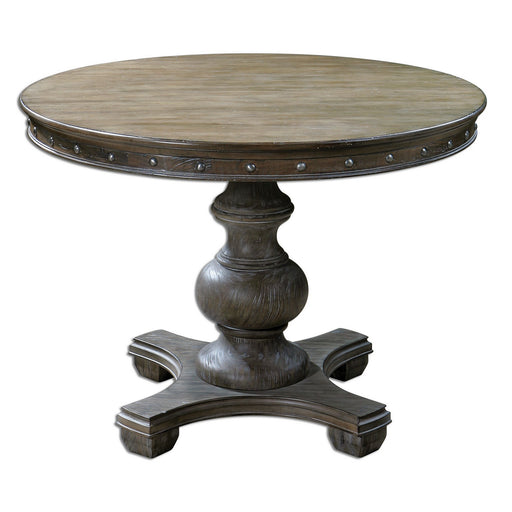 A Light Gray Wash Softens The Look Of This Weathered, Natural Pine Table With Carved Apron And Silver Nail Accents. Sturdy Pedestal Base Is Fully W...