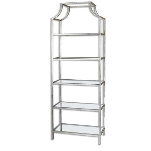 Transitional In Style, This Forged Iron Etagere Features A Bright Silver Leaf Finish With Five Tempered Glass Shelves.Details:Product Type: Bookcas...