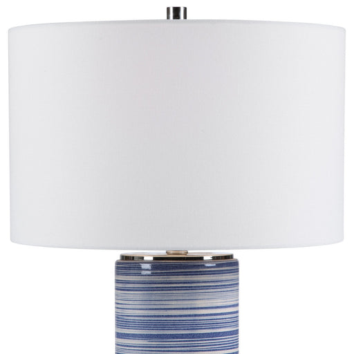 Showcasing Trendy White And Indigo Blue Hues, This Ceramic Table Lamp Has A Striped Glaze With Polished Nickel Accents. The Round Hardback Drum Sha...