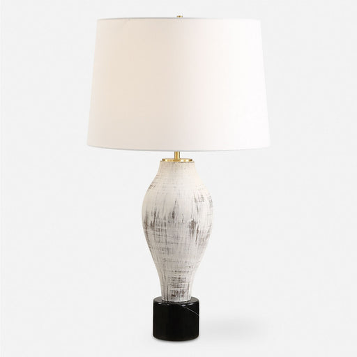 The Magdalene Table Lamp Exudes Rustic Elegance With Its Heavily Distressed Porcelain Base, Perfectly Contrasted By A Black Marble Foot, And Accent...