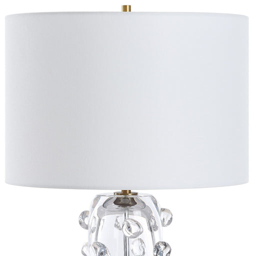 The Aura Table Lamp Features A Clear Glass Base Adorned With Organic Glass Spheres, Set Atop A Plated Brushed Brass Foot. A Round Drum Hardback Sha...