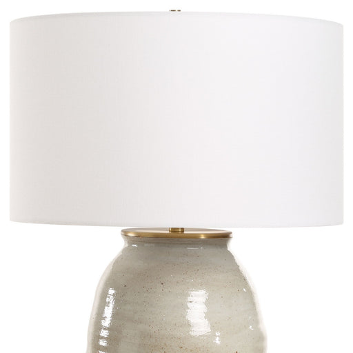 This Ceramic Table Lamp Features A Greenish Tan Glaze With Dark Undertones, Accented With Plated Antique Brass Details. The Slightly Tapered Round ...